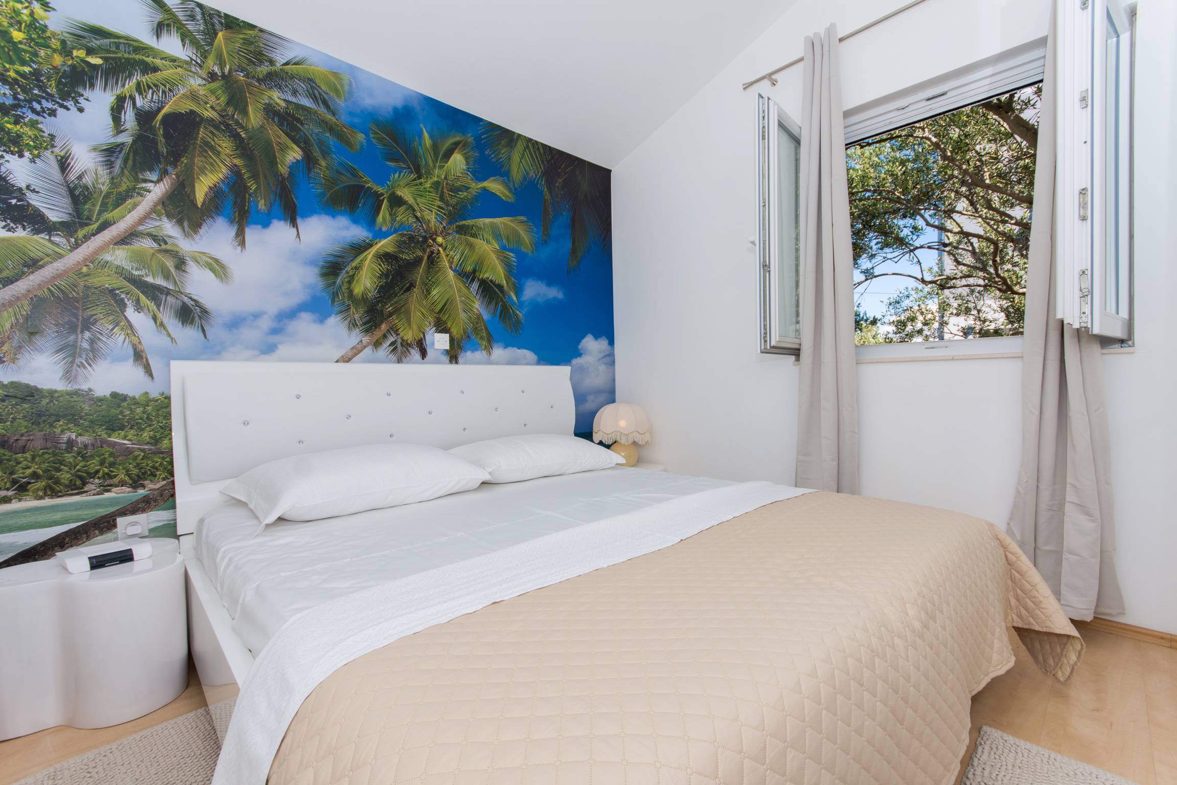 The Pool House sits in a peaceful plot on Čiovo, framed by ancient olive trees. It is the only accommodation at Adriatic House with its own private pool — an 8 × 4 × 1.5 m rectangle of blue that catches the Adriatic sky all day long.